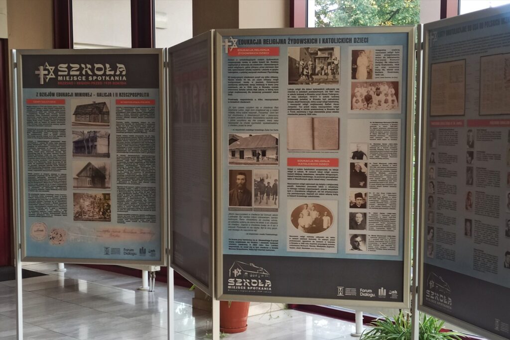 Już od drugiej połowy XIX wieku szkoły ludowe w powiecie brzeskim faktycznie były miejscem spotkania katolickich i żydowskich dzieci. Kolejne plansze wystawowe są poświęcone systemowi edukacji w Galicji i II Rzeczpospolitej, religijnej edukacji katolickich i żydowskich dzieci; szkołom ludowym w Brzesku, Okocimiu, Borzęcinie, brzeskiemu gimnazjum; możecie państwo przeczytać wspomnienia katolickich i żydowskich uczniów szkół powiatu brzeskiego, poznać losy niektórych absolwentów…