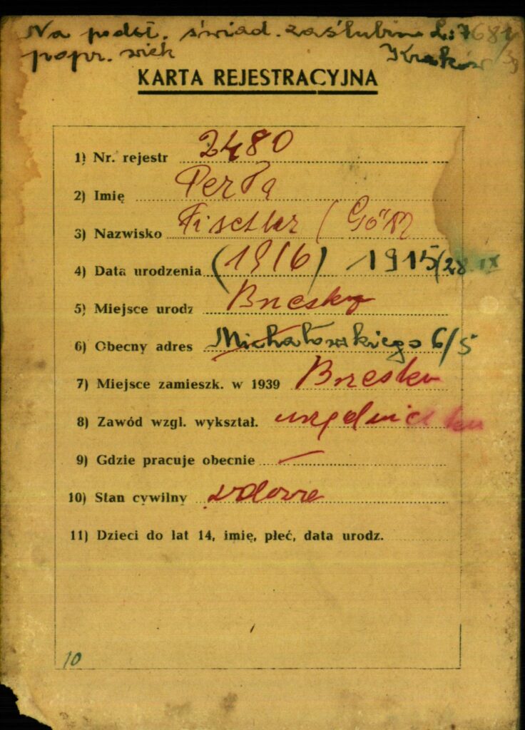 Urodzona w Brzesku 28 września 1915 roku, córka Chaskela Habera/Fischlera i Chaji z domu Vogelhut/Fischler; uczęszczała do gimnazjum w latach 1929-1935; w 1939 roku wyszła za mąż w Krakowie za Jakoba Goetza z Grybowa. Jakob został zamordowany w Auschwitz 22 stycznia 1942 roku, Perła przeżyła i wróciła do Krakowa.