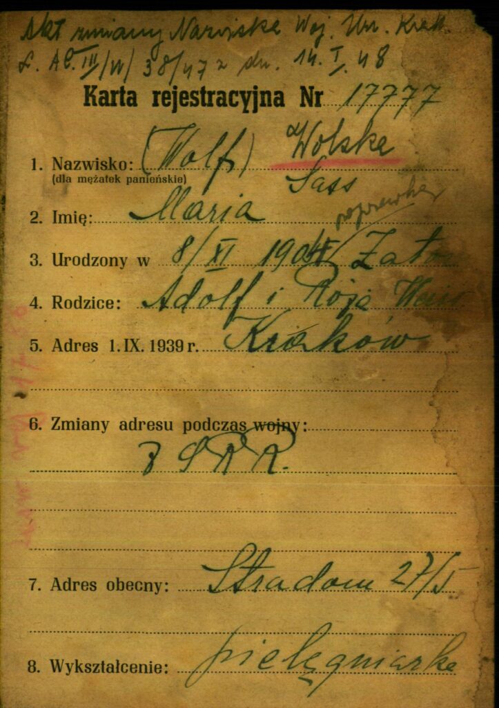 Urodzona w Zatorze 8 listopada 1904 roku; córka Adolfa Sassa i Rozy Weiss. Uczęszczała do gimnazjum w roku szkolnym 1913/1914, w tym czasie mieszkała w Brzesku u Salamona Kohsa. Została pielęgniarką, mieszkała w Krakowie. Przeżyła wojnę w Związku Radzieckim, wróciła do Krakowa. W 1948 roku zmieniła nazwisko na Wolska.